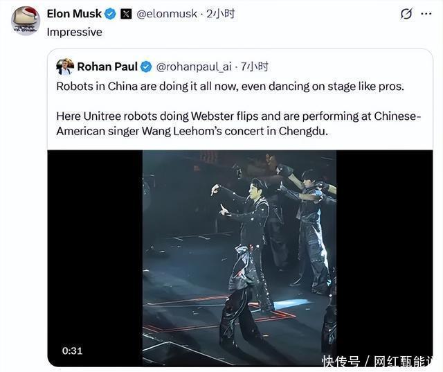 两天后,这场表演的火热程度从舞台蔓延至全球科技圈。特斯拉CEO埃隆·马斯克在社交平台转发相关视频,并配文评价“令人印象深刻!”。这一简短点赞,迅速将中国演唱会现场画面推向海外科技爱好者视野,引发密集关注。视频中,机器人舞群与王力宏及人类舞者精准互动,其协调性与完成度令众多网友惊叹。